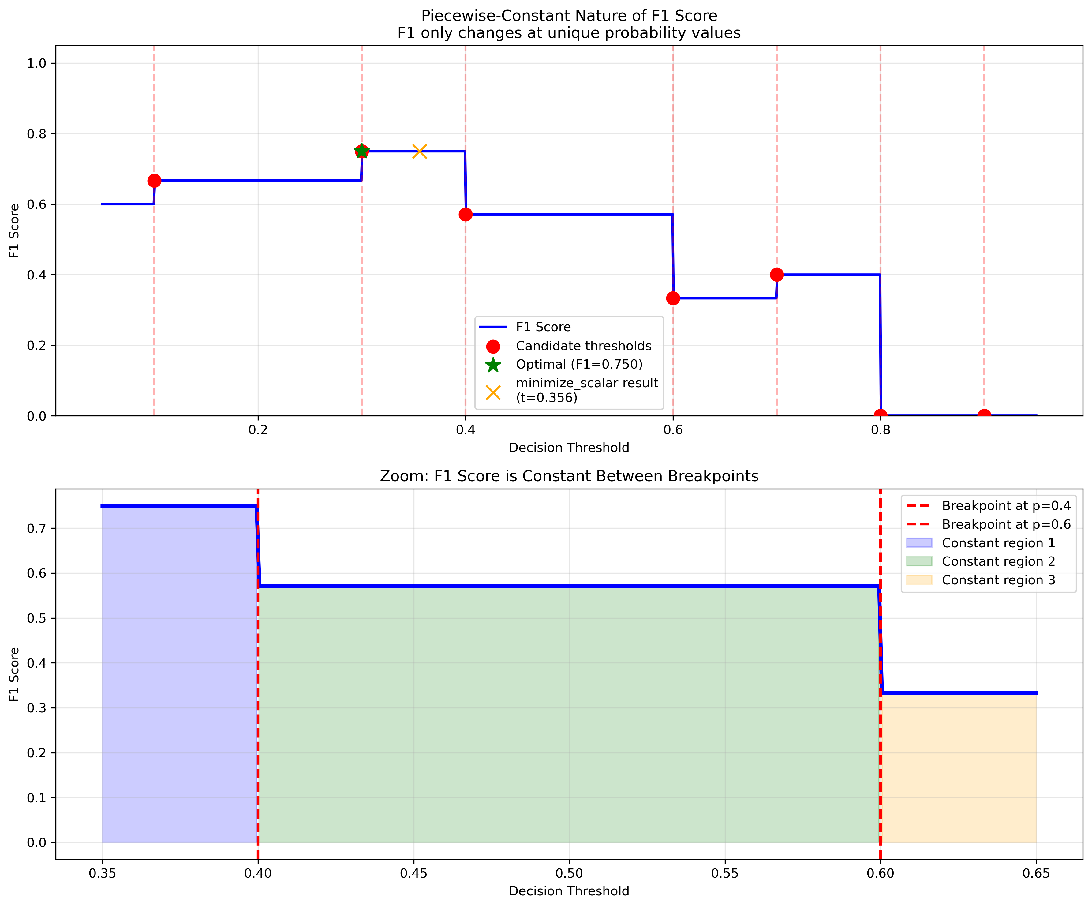 ✅ sort_scan: O(n log n) exact algorithm for piecewise metrics ✅ smart_brute: Evaluates only unique probability values ⚠️ minimize: Standard scipy optimization (often suboptimal)
